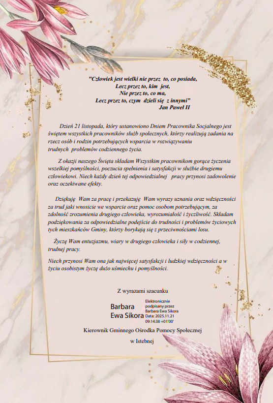 Z okazji Dnia Pracownika Socjalnego składamy najserdeczniejsze życzenia zdrowia, pogody ducha, nieustającej energii, a także wyrazy uznania za zaangażowanie, trud i wysiłek oraz wyzwania z jakimi się spotykacie każdego dnia.